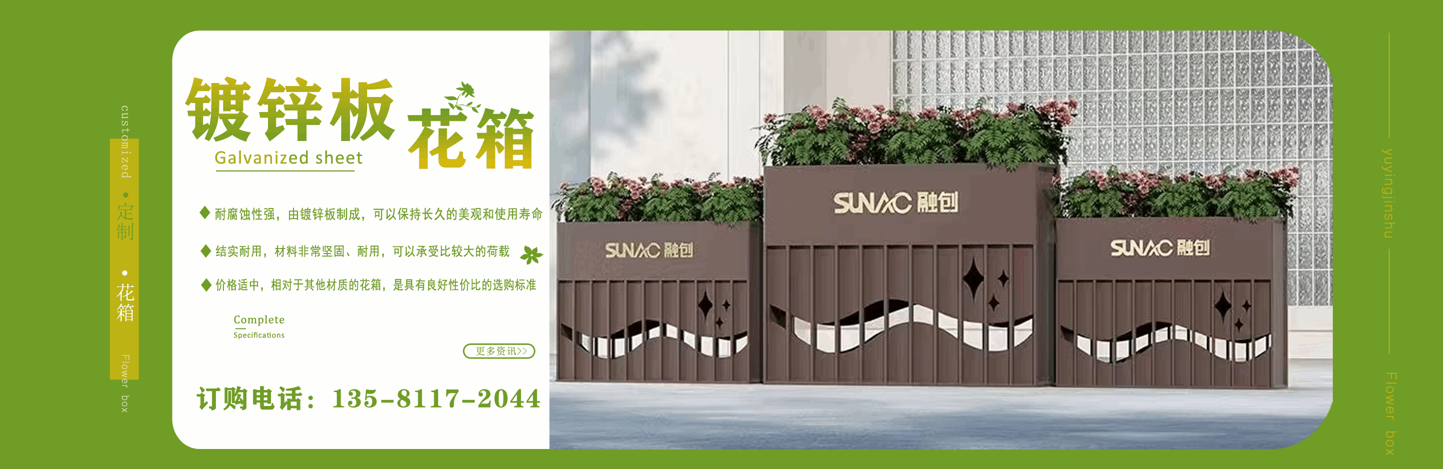 山東鈺盈金屬制品有限公司主營鍍鋅板花箱,道路隔斷花箱,定制花箱,戶外道路花箱,花箱座椅等產(chǎn)品,產(chǎn)品結(jié)構(gòu)合理、性能優(yōu)良,具有強度高、耐腐蝕、抗老化、隔熱隔音、節(jié)約能源、外形美觀、使用壽命長等優(yōu)點,深受國內(nèi)外客戶認可。 我們根據(jù)客戶所在城市的文化特征,制造出符合當?shù)爻鞘形幕瘹庀⒌淖匀涣Ⅲw、觀賞性強的花箱產(chǎn)品成為城市里一道靚麗的風(fēng)景線。 公司實行誠實、公正、守信、價格合理、平等互利。 公司憑借雄厚經(jīng)驗實力,恪守誠信為本的原則,得到了眾多客戶的信賴,并在業(yè)界獲得良好的口碑。建立了穩(wěn)固的合作關(guān)系,隨著業(yè)務(wù)的不斷發(fā)展和壯大,合作伙伴的范圍也在不斷擴大。我們熱情盼望與您的合作,為社會的可持續(xù)發(fā)展獻上一份努力。...