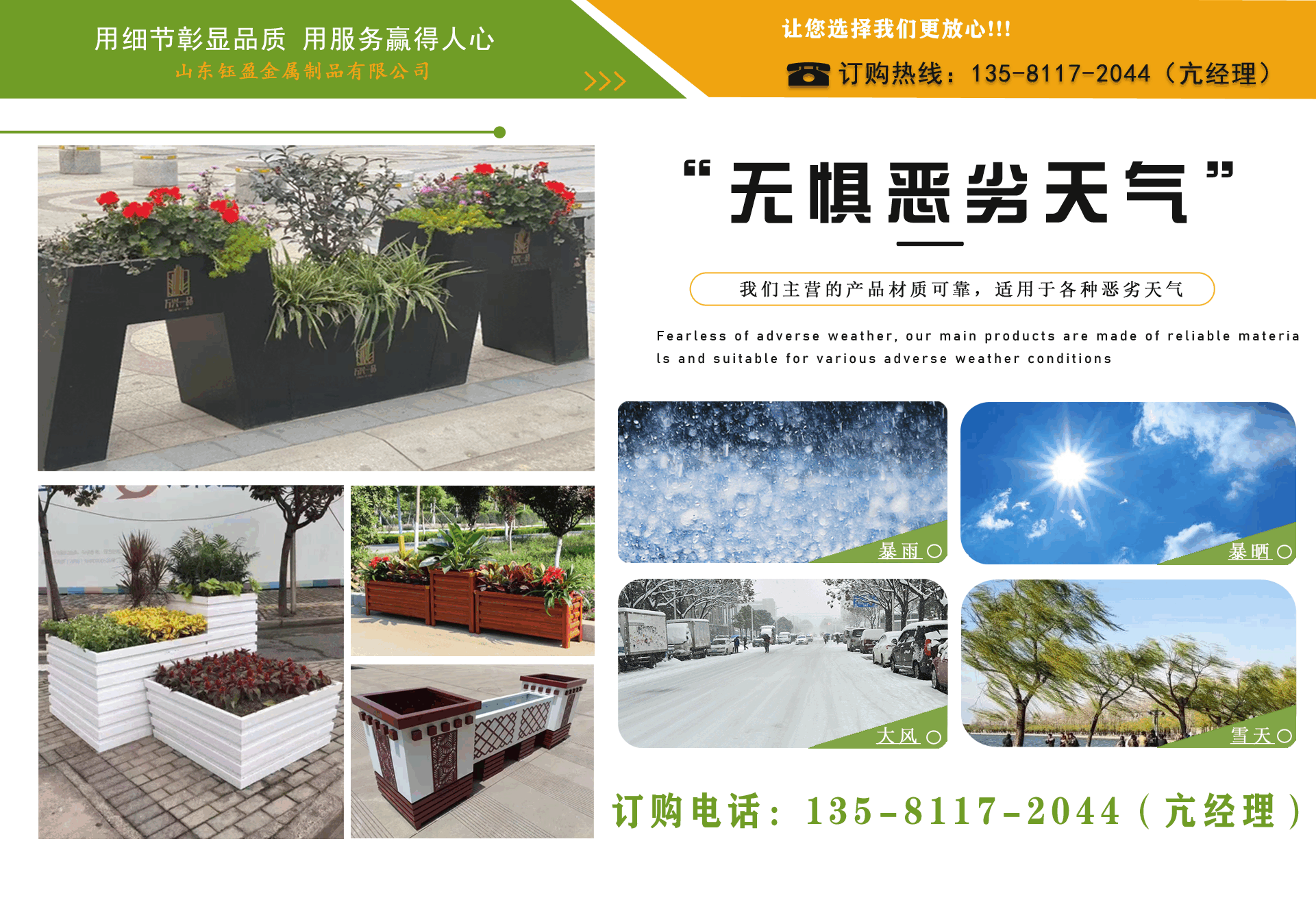 山東鈺盈金屬制品有限公司主營鍍鋅板花箱,道路隔斷花箱,定制花箱,戶外道路花箱,花箱座椅等產(chǎn)品,產(chǎn)品結(jié)構(gòu)合理、性能優(yōu)良,具有強度高、耐腐蝕、抗老化、隔熱隔音、節(jié)約能源、外形美觀、使用壽命長等優(yōu)點,深受國內(nèi)外客戶認可。 我們根據(jù)客戶所在城市的文化特征,制造出符合當?shù)爻鞘形幕瘹庀⒌淖匀涣Ⅲw、觀賞性強的花箱產(chǎn)品成為城市里一道靚麗的風(fēng)景線。 公司實行誠實、公正、守信、價格合理、平等互利。 公司憑借雄厚經(jīng)驗實力,恪守誠信為本的原則,得到了眾多客戶的信賴,并在業(yè)界獲得良好的口碑。建立了穩(wěn)固的合作關(guān)系,隨著業(yè)務(wù)的不斷發(fā)展和壯大,合作伙伴的范圍也在不斷擴大。我們熱情盼望與您的合作,為社會的可持續(xù)發(fā)展獻上一份努力。...